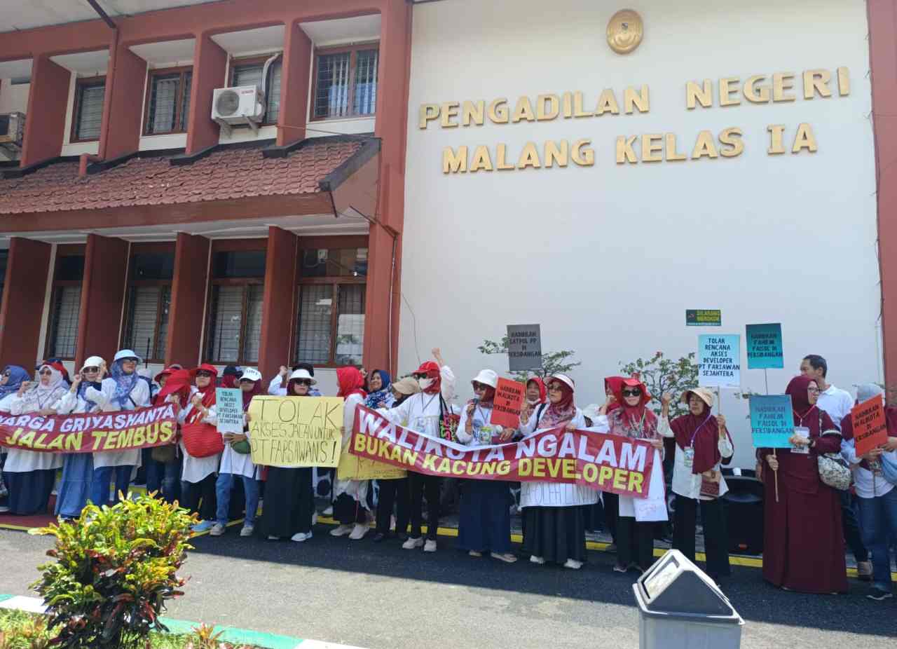 Warga yang hadir di PN Malang pun tak tinggal diam. Puluhan orang kembali menggelar aksi damai sembari membawa poster penolakan sebagai simbol protes terhadap kebijakan yang mereka anggap merugikan dan tidak transparan.